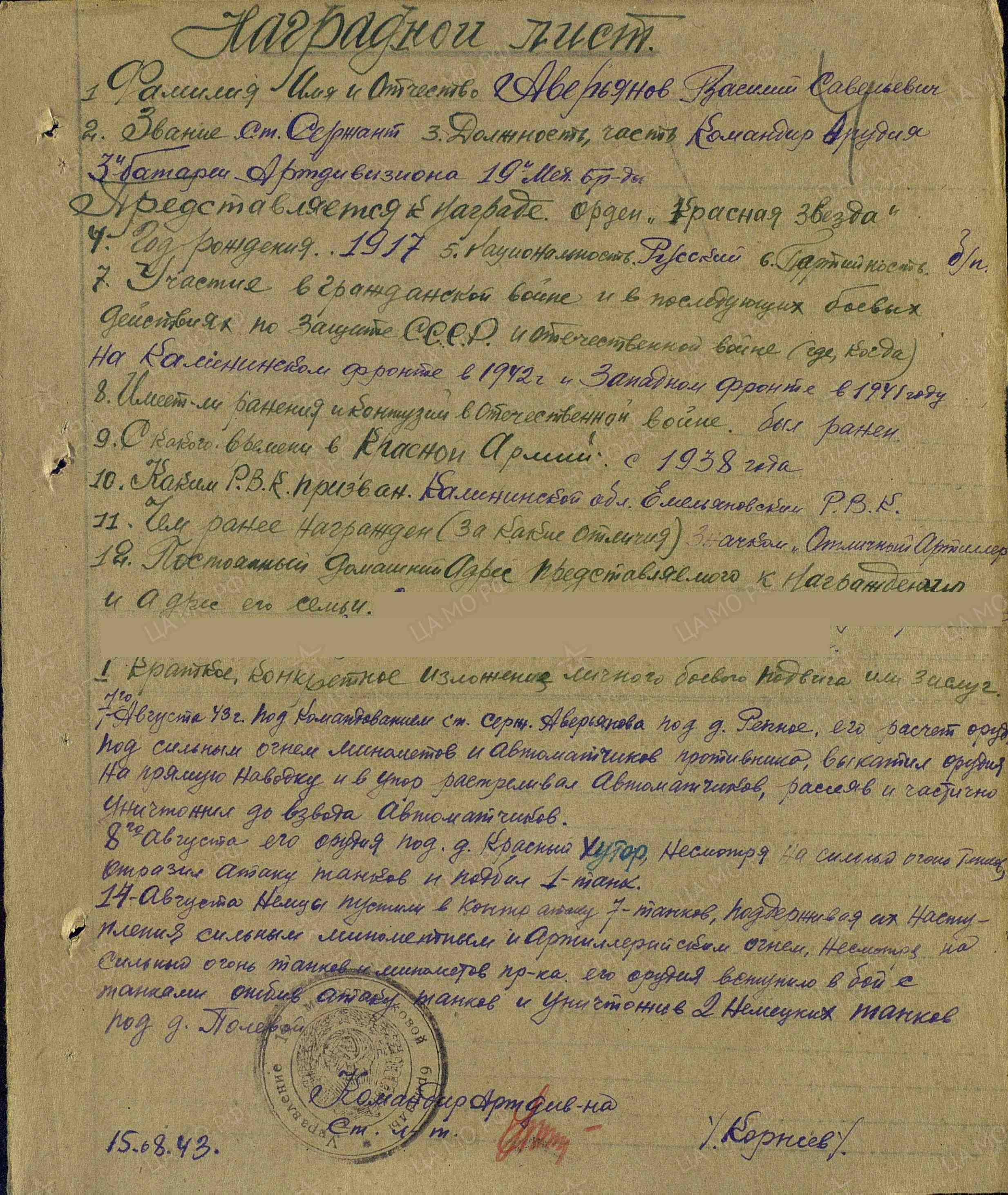 Геройски вели себя на поле боя артиллеристы. Командир орудия старшина Аверьянов и командир орудия сержант Азаров со своими расчётами, находясь впереди боевых порядков пехоты, дважды отбивали контратаки немцев. Они уничтожили большое количество живой силы и техники врага.