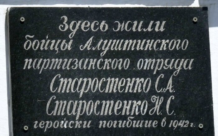д. 14 — бойцы Алуштинского партизанского отряда в годы Великой Отечественной войны С.А. и С. Н. Старостенко (мемориальная доска)[8]